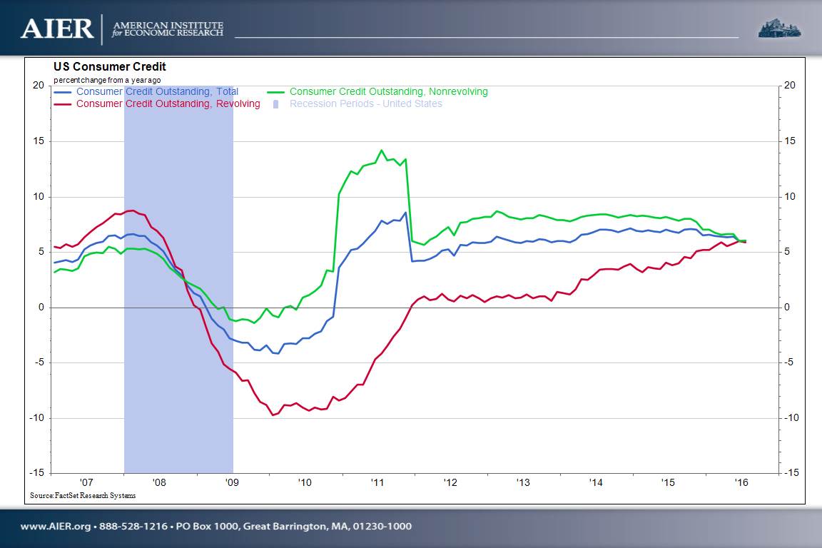 These monthly changes can be volatile. Looking at the data on a 12-month percent change basis helps smooth out the volatility. Over the past year, total consumer credit has risen at a 6.0 percent pace. Revolving credit has risen by 5.9 percent, while nonrevolving credit has gained 6.1 percent.