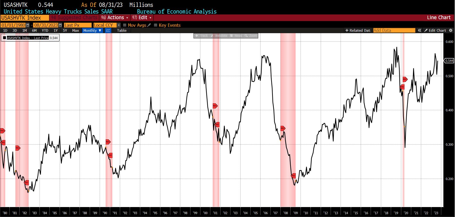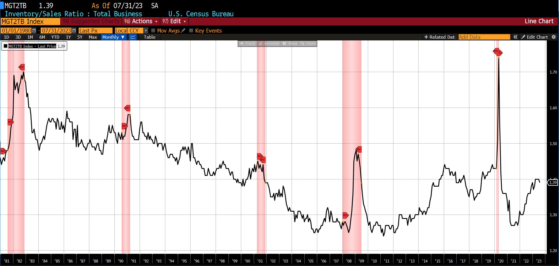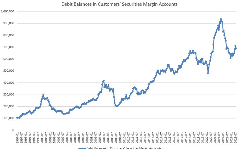 Declining from July to August 2023 were the University of Michigan Consumer Expectations Index (-4.10 percent), the Conference Boardโs US Leading Index of 500 Stock Prices (-1.13 percent), the US Census Bureauโs Inventory/Sales Ratio Total Business (-0.71 percent), US New Privately Owned Housing Units Starts (-11.64 percent), United States Heavy Truck Sales (-1.92 percent), and FINRA Debt Balances in Margin Accounts (-2.91 percent). US Average Weekly Hours (All Employees, Manufacturing) was unchanged.