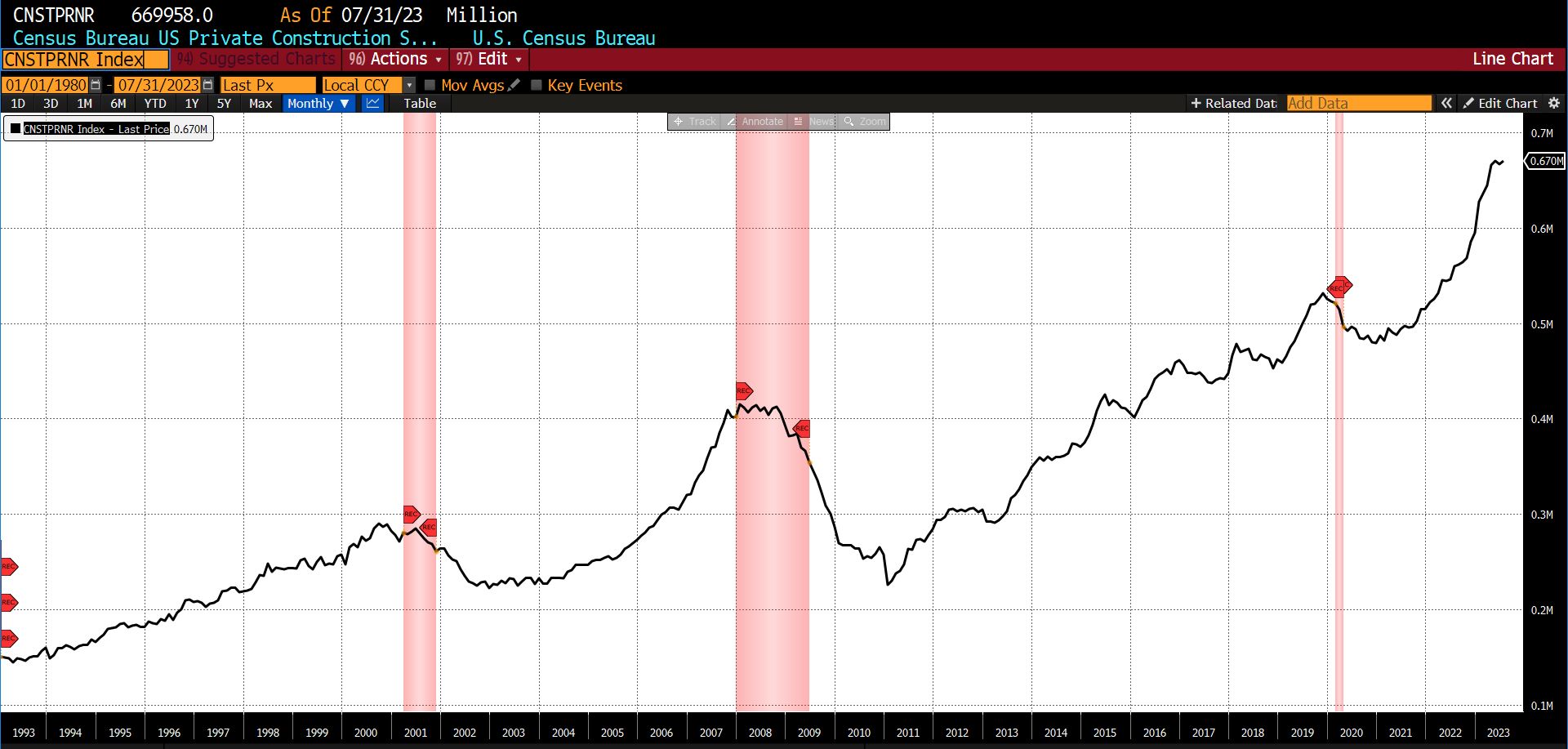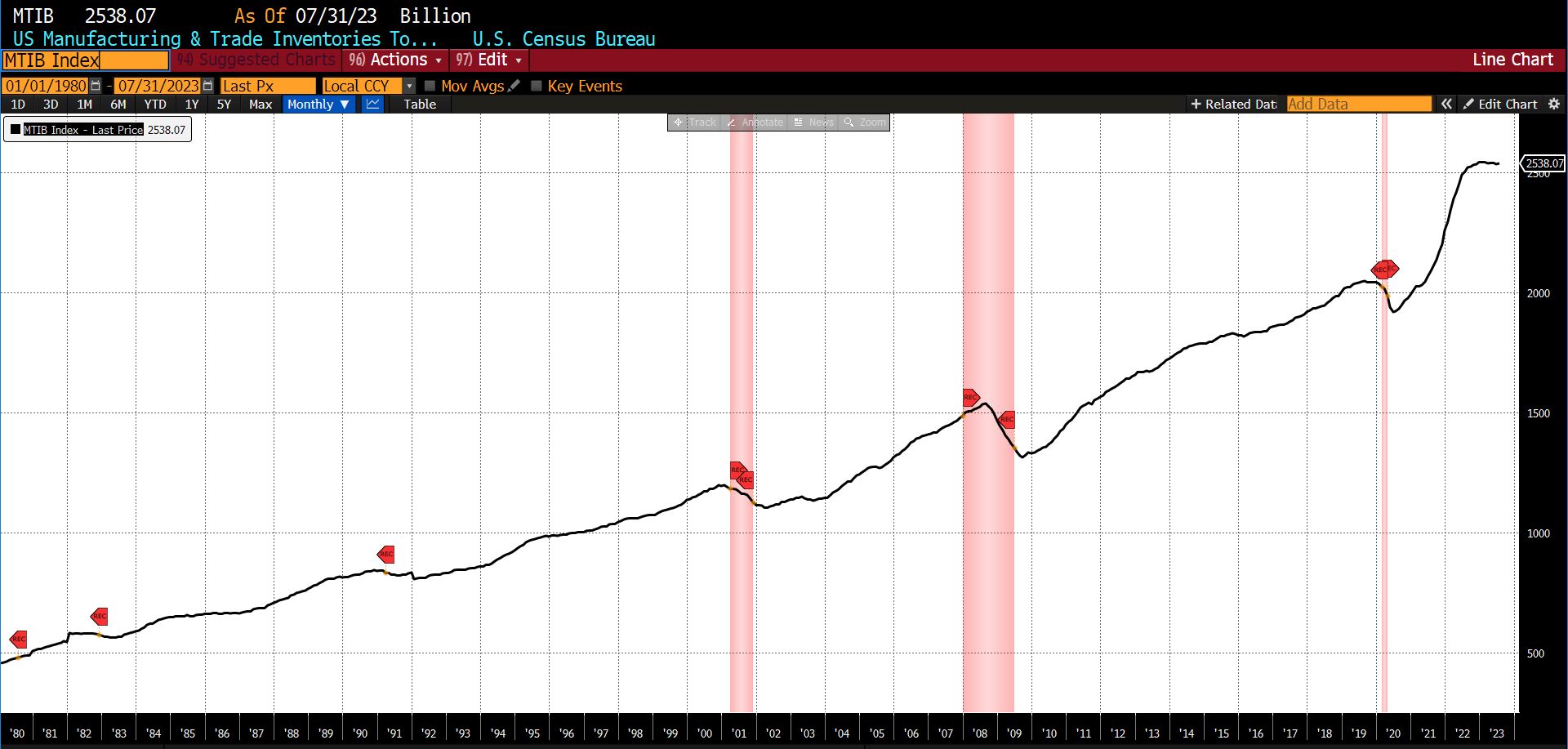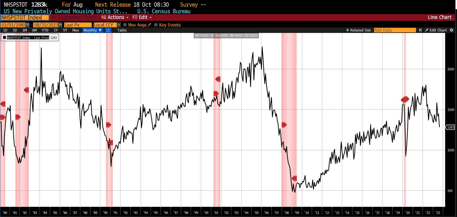 Declining from July to August 2023 were the University of Michigan Consumer Expectations Index (-4.10 percent), the Conference Boardโs US Leading Index of 500 Stock Prices (-1.13 percent), the US Census Bureauโs Inventory/Sales Ratio Total Business (-0.71 percent), US New Privately Owned Housing Units Starts (-11.64 percent), United States Heavy Truck Sales (-1.92 percent), and FINRA Debt Balances in Margin Accounts (-2.91 percent). US Average Weekly Hours (All Employees, Manufacturing) was unchanged.