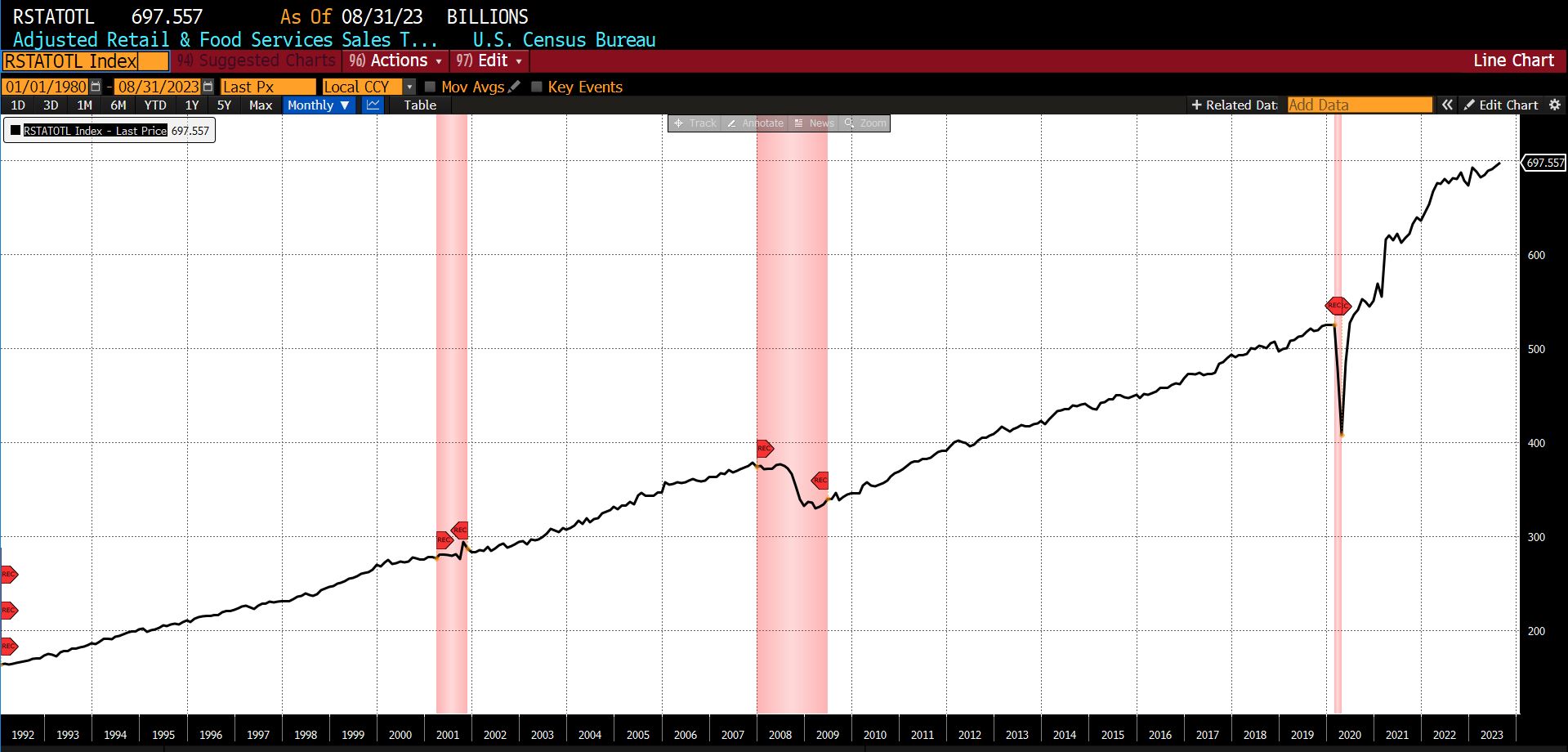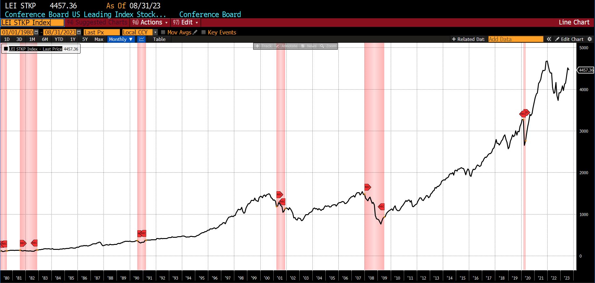 Five of the twelve constituents rose, six declined, and one was unchanged/neutral. Rising from July to August 2023 were the US Initial Jobless Claims (8.73 percent), the Conference Boardโs US Leading Index of Manufacturers New Orders, Consumers Goods, and Materials (0.07 percent), the Conference Boardโs US Manufacturers New Orders of Capital Goods Excluding Aircraft (0.47 percent), Adjusted Retail and Food Service Sales (0.56 percent), and the 1-to-10 year US Treasury spread (10.12 percent).