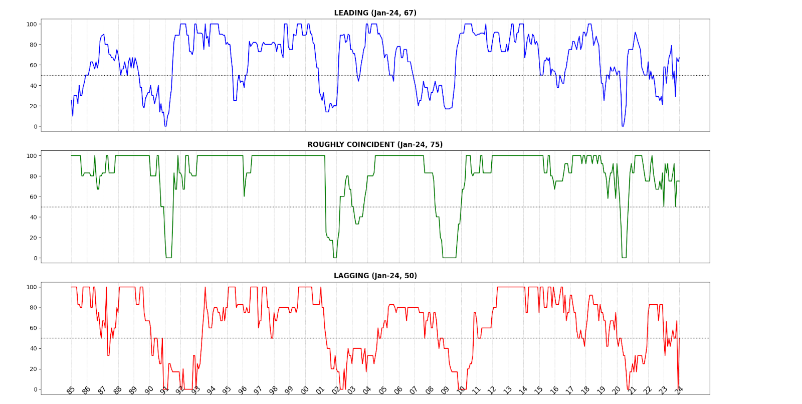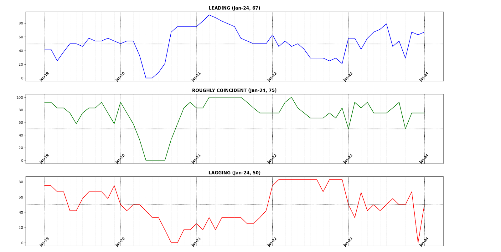 In January 2023, two of the AIER Business Conditions Monthly returned to the expansionary levels which characterized the last six to eight months. The Leading Indicator returned to its November 2023 level of 67 after dipping to 63, while the Roughly Coincident Indicator spent a third month at the 75. The Lagging Indicator, which plunged from 67 In November 2023 to 0 in December returned to 50, again exemplifying the high noise-to-signal ratio in post-pandemic economic data.