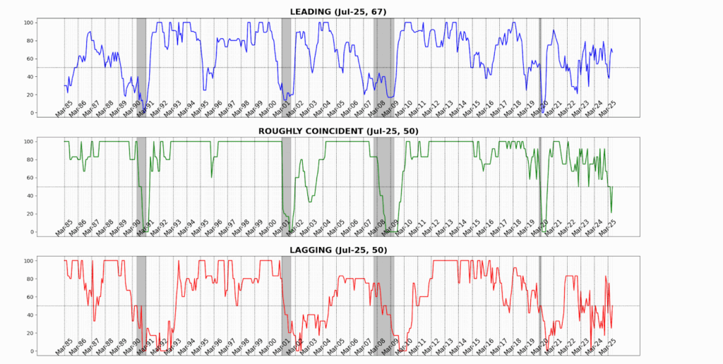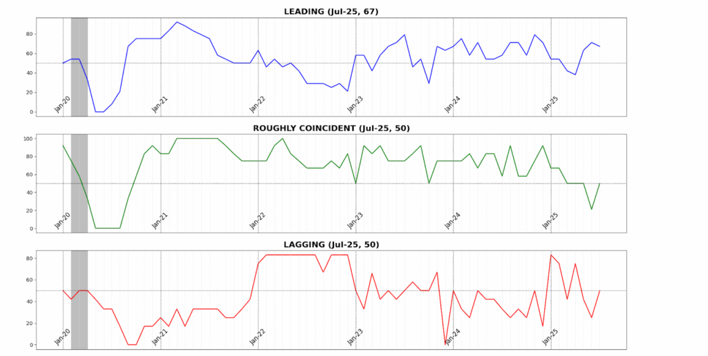 The Roughly Coincident Indicator rose from 21 to 50, marking a pause after Juneโs sharp contraction. Stability at this level reflects an offsetting mix of modest gains in sales, income, and payrolls against declines in production, participation, and sentiment โ leaving the real-time picture flat but fragile.