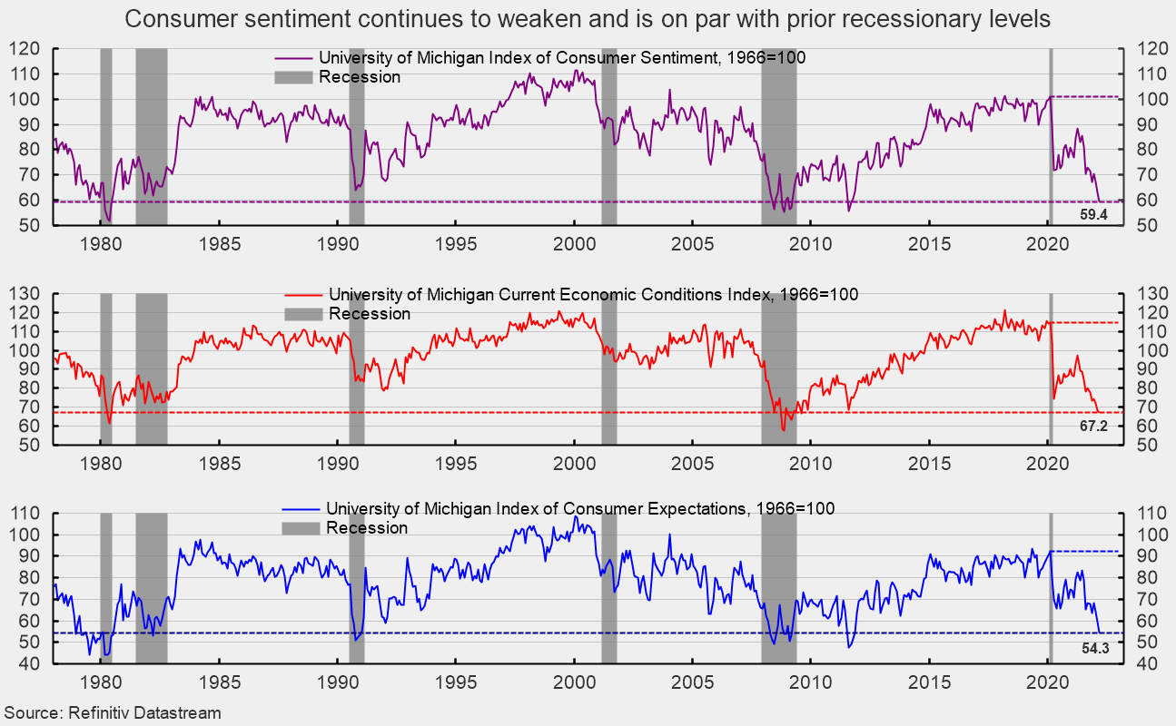 According to the report, โConsumer Sentiment remained largely unchanged in late March at the same diminished level recorded at mid month. Inflation has been the primary cause of rising pessimism, with an expected year-ahead inflation rate at 5.4%, the highest since November 1981. Inflation was mentioned throughout the survey, whether the questions referred to personal finances, prospects for the economy, or assessments of buying conditions.โ