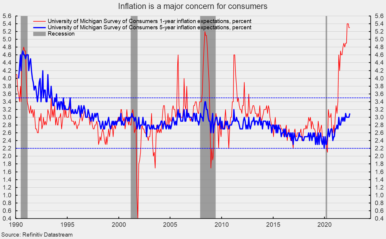 The one-year inflation expectations was unchanged at 5.3 percent in June, just below the March and April 2022 level of 5.4 percent. The one-year expectations has spiked above 3.5 percent several times since 2005 only to fall back (see second chart).