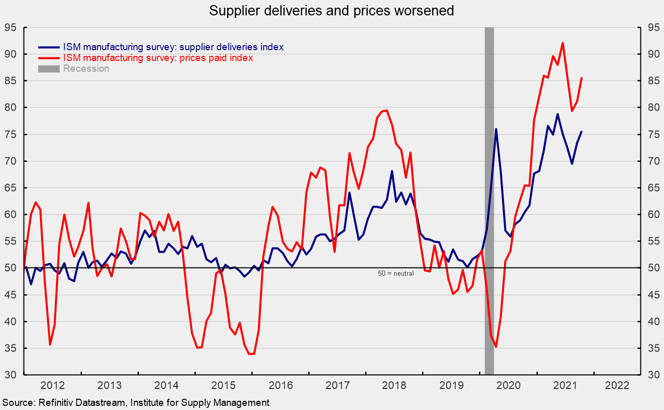 The index for prices for input materials moved back up in October, coming in at 85.7 percent versus 81.2 percent in September. While the index is down from a recent peak of 92.1 in June, it is still very high. Rising input costs have been driven by shortages of materials and labor as well as production issues and logistical and transportation problems. Those issues are reflected in the supplier deliveries index, which rose again in October to 75.6 from 73.4, suggesting deliveries slowed again in October.