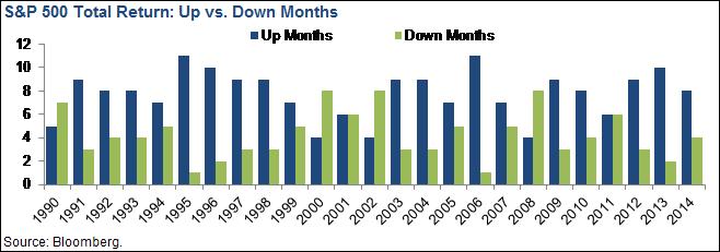 You know this, but it is worth repeating for the sake of your sanity. Markets go up and down daily. For every buyer, there is a seller. But there is a broader historical point here. Even during periods of relative growth, there are negative stretches. Likewise, during downturns there are upswings. Since 1990, there has never been a calendar year during which all 12 months were all up or all down for the S&P 500. 2013 was a great year for stocks and still saw two down months. 2008 was a terrible year and still saw four up months. Historically, stock markets tend to trend upward, but we should certainly expect that markets will go up AND down.