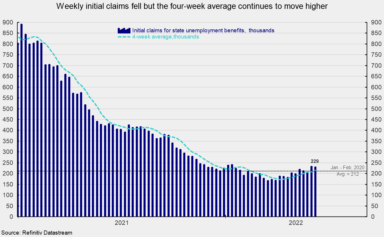 However, the four-week average rose for the ninth time in the last ten weeks, coming in at 218,500, up 2,750 from the prior week and at the highest level since March 12th. Weekly initial claims data continue to suggest a very tight labor market, though the recent upward trend is a growing concern. The Russian invasion of Ukraine, periodic lockdowns in China, and an intensifying Fed tightening cycle are likely to impact the global economy over coming months and represent risks to the economic outlook.