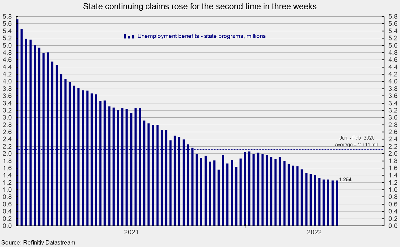 The number of ongoing claims for state unemployment programs totaled 1.256 million for the week ending May 28, a rise of 1,639 from the prior week (see second chart). State continuing claims have now risen in two of the last three weeks though the level remains very low (see second chart).
