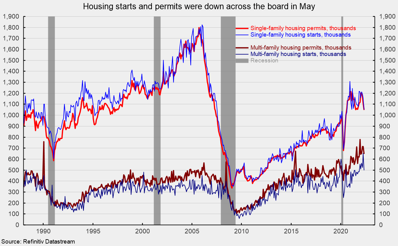 Total housing starts fell to a 1.549 million annual rate in May from a 1.810 million pace in April, a 14.4 percent plunge. From a year ago, total starts are down 3.3 percent. Total housing permits also fell in May, posting a 7.0 percent drop to 1.695 million versus 1.823 million in April. Total permits are still up 0.2 percent from the May 2021 level.