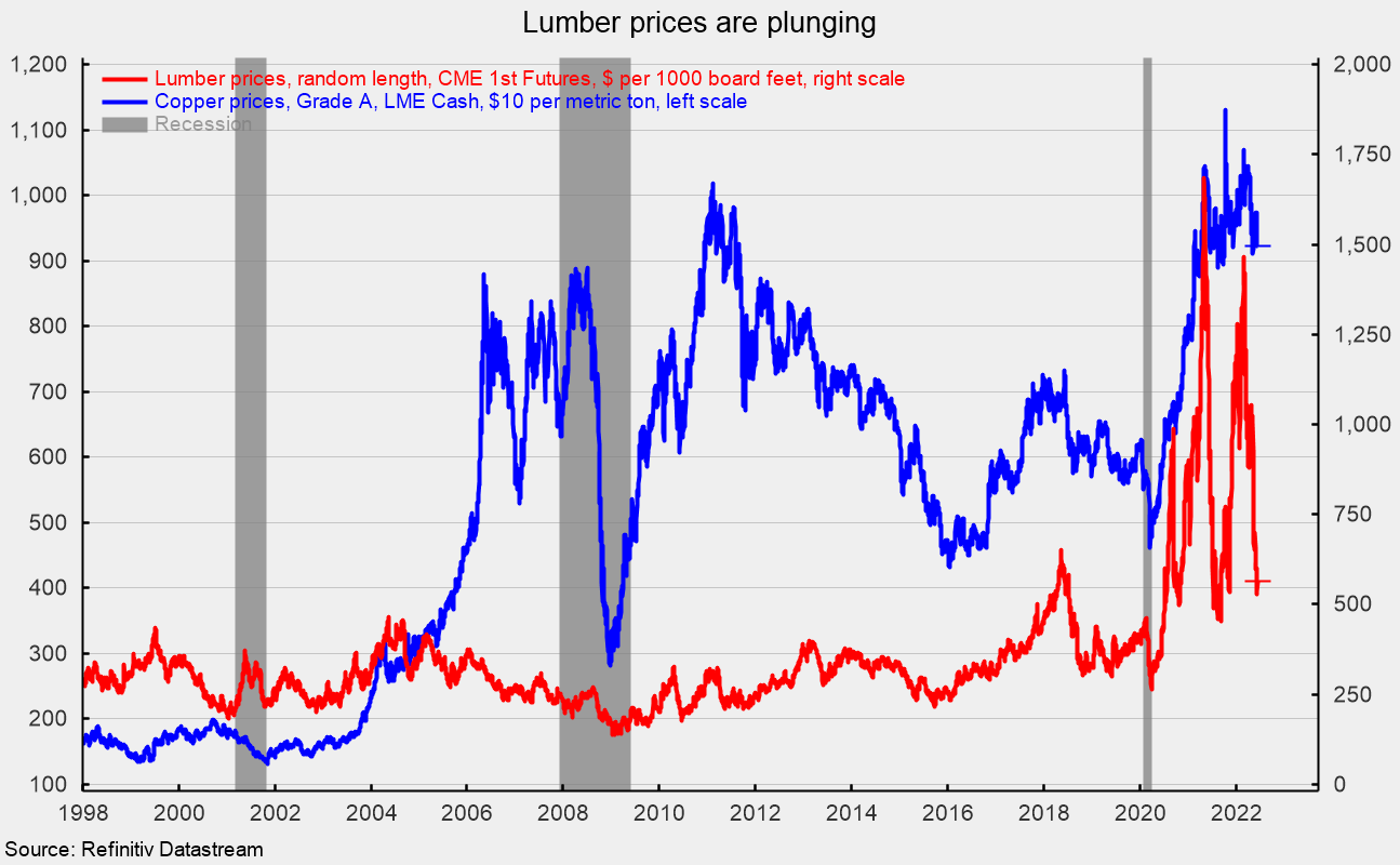 Input costs are still a concern for builders though lumber prices have declined sharply recently. Lumber recently traded around $560 per 1,000 board feet in mid-June, down from peaks around $1,700 in May 2021 and $1,500 in early March 2022. Other input materials such as copper were down slightly but still elevated with copper at $9,200 per metric ton (see third chart). The high input costs will continue to pressure profits at builders.