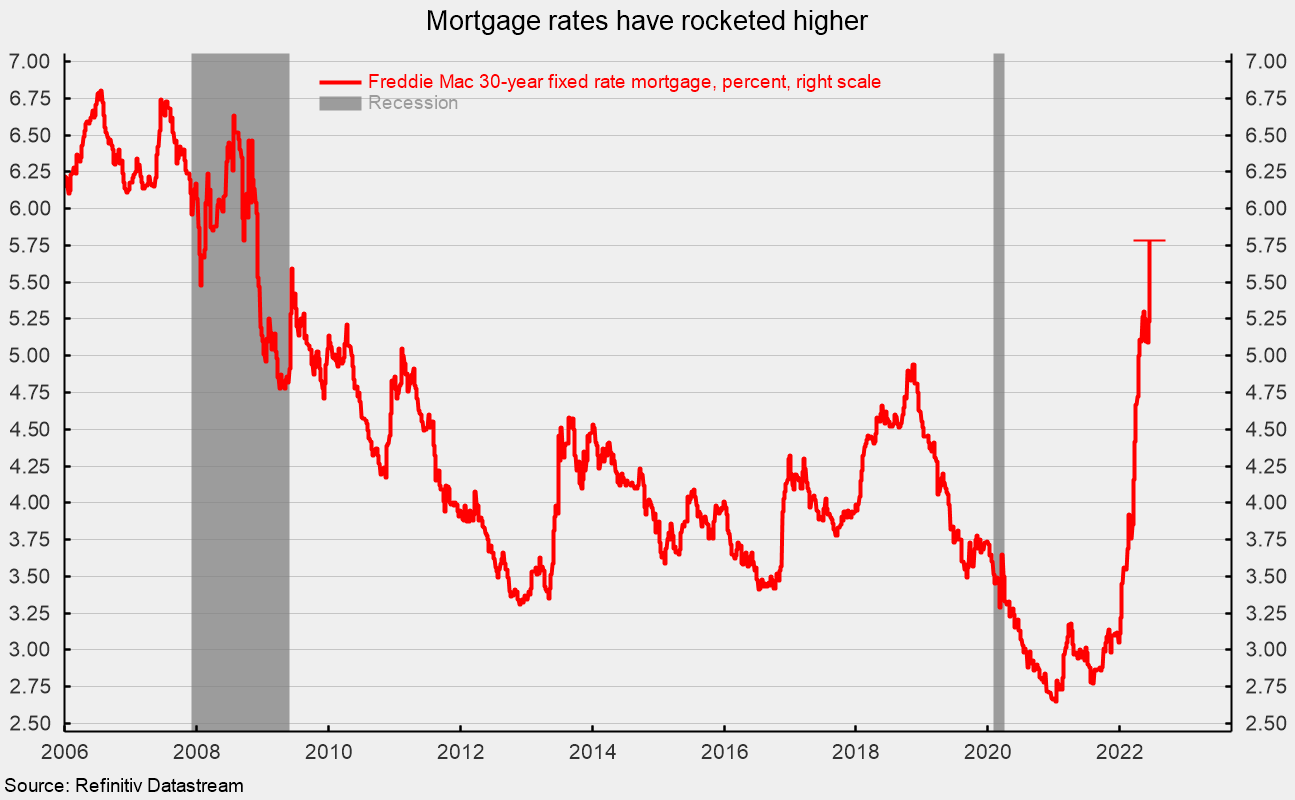 Mortgage rates have rocketed higher recently, with the rate on a 30-year fixed rate mortgage coming in at 5.25 percent in mid-June, nearly double the lows in early 2021 (see fourth chart).
