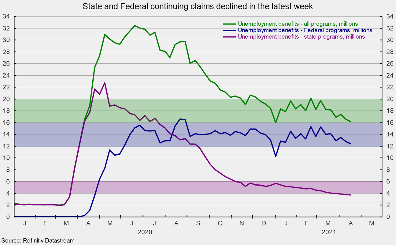 The total number of people claiming benefits in all unemployment programs including all emergency programs was 16.157 million for the week ended April 17, down 404,509 from the prior week. Total claims have been in the 16 to 20 million range since November but have fallen in five of the last six weeks and are at the second-lowest level since April 4, 2020 (see second chart).