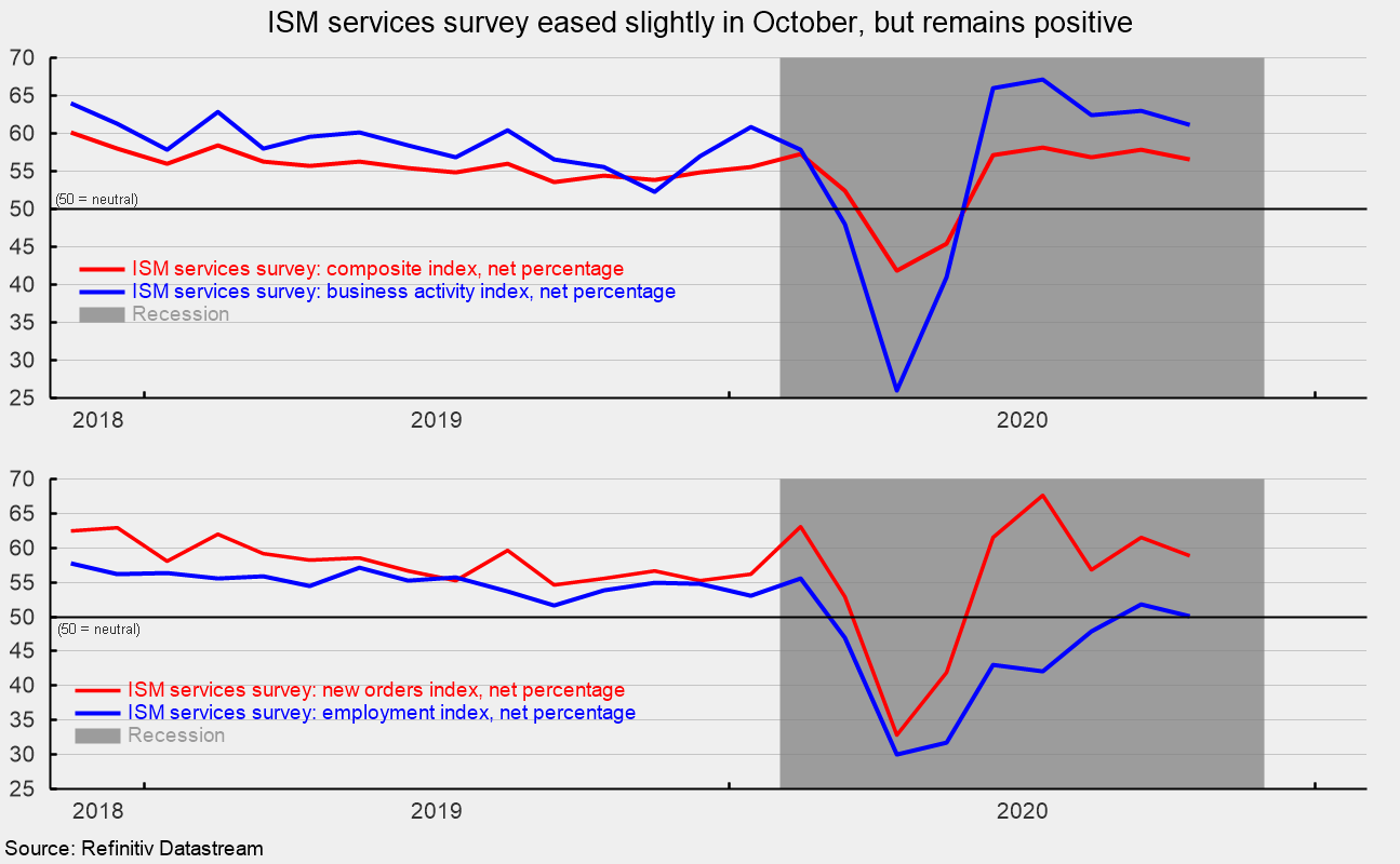 The Institute for Supply Managementโs composite services index posted a 1.2 percentage-point decrease in October, dropping to a reading of 56.6 from 57.8 in the prior month. Despite the decline, the October results remain solidly above neutral and suggest the fifth consecutive month of expansion for the services sector and the broader economy, following three months below neutral from March through May (see top chart).