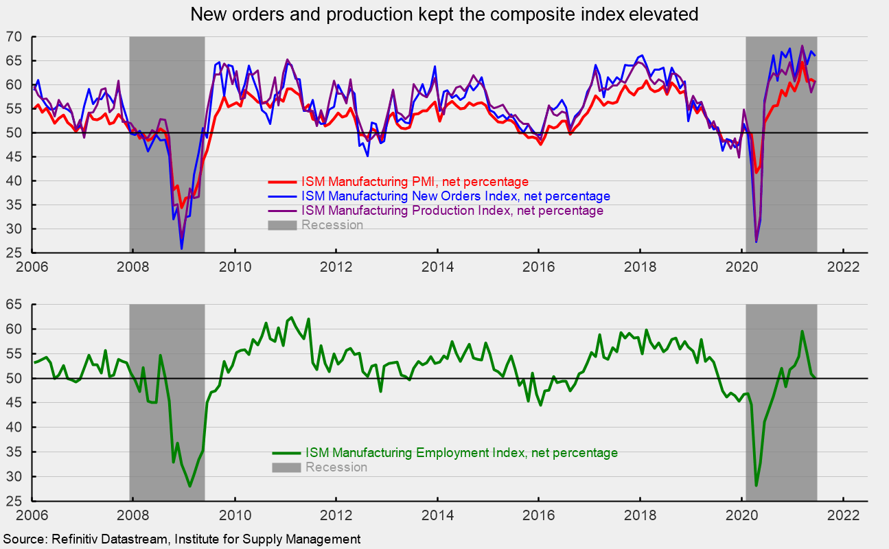 The Institute for Supply Managementโs Manufacturing Purchasing Managersโ Index fell to 60.6 in June, a drop of 0.6 points over the 61.2 percent result in May. June is the 13th consecutive reading above the neutral 50 threshold and fifth consecutive month above 60 (see top of first chart). Over the past 12 months, the Purchasing Managersโ Index has averaged 59.1, the highest since November 2018. The survey results suggest that the manufacturing sector continues to expand at a robust pace.