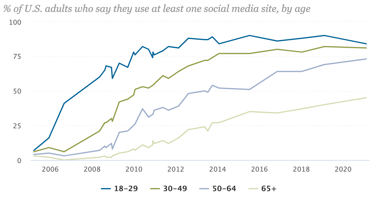 On the other hand, we observe slightly upward trends for every other generation. For Boomers, the desire to stay in touch with loved ones explains the small increases in usage, as they reportedly resist instant messaging and prefer videos and images rather than text. Additionally, those in between young and elderly rely on socials such as LinkedIn, WhatsApp, and Messenger, and comprise the greatest percentage of users on those platforms. For these groups, potential concerns about privacy are thus offset by rational, expected behavior in the form of professional development and personal connection.