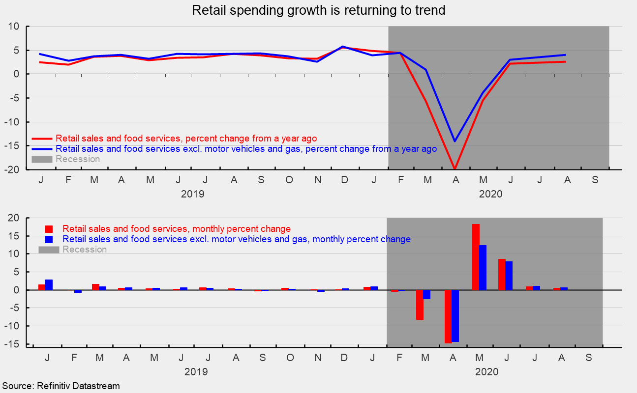 Retail sales and food-services spending posted another gain in August, rising 0.6 percent from the prior month. However, the gain was below the 1.0 percent consensus expectation and follows a downwardly revised 0.9 percent gain in July (from an initial estimate of a 1.2 percent increase). The August gain was the fourth in a row following two devastating declines in March and April but was the slowest of the four increases (see bottom of first chart). From a year ago, retail sales are up 2.6 percent (see top of first chart).