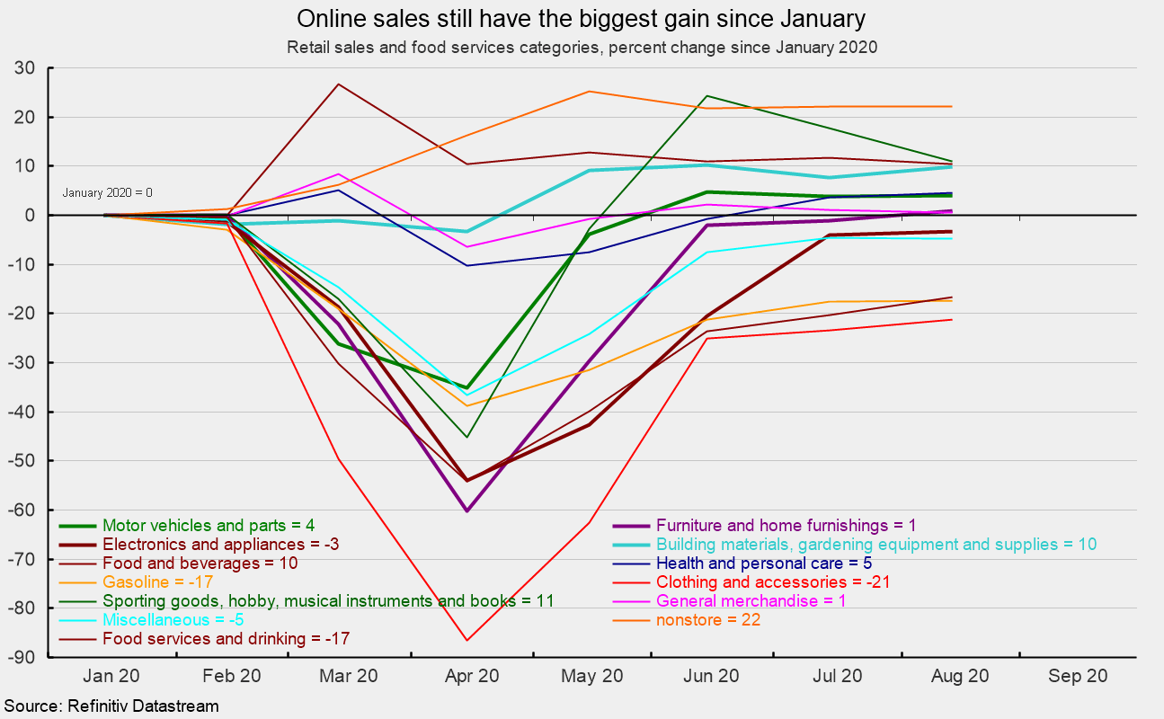 Categories that are below their January 2020 levels include clothing and accessory stores (up 2.9 percent in August but down 20.4 percent from a year ago and 21 percent below January 2020), food services (up 4.7 percent in August but down 15.4 percent from a year ago and 17 percent below January), gasoline stations (up 0.4 percent for the month but down 15.4 percent for the year and 17 percent since January). Electronics and appliance stores gained 0.8 percent leaving sales 2.4 percent below a year ago (and 3 percent below January) and miscellaneous stores fell 0.2 percent with sales below a year ago and below January.