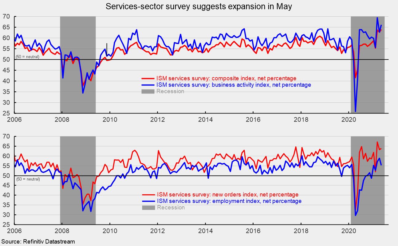The latest report from the Institute of Supply Management suggests that the services sector and the broader economy expanded again in May. Several respondents to the survey mentioned improving levels of activity but also increased price pressures and materials shortages, particularly related to supply chain, logistics, and transportation issues as well as labor difficulties. Overall, the outlook remains tilted to the upside.