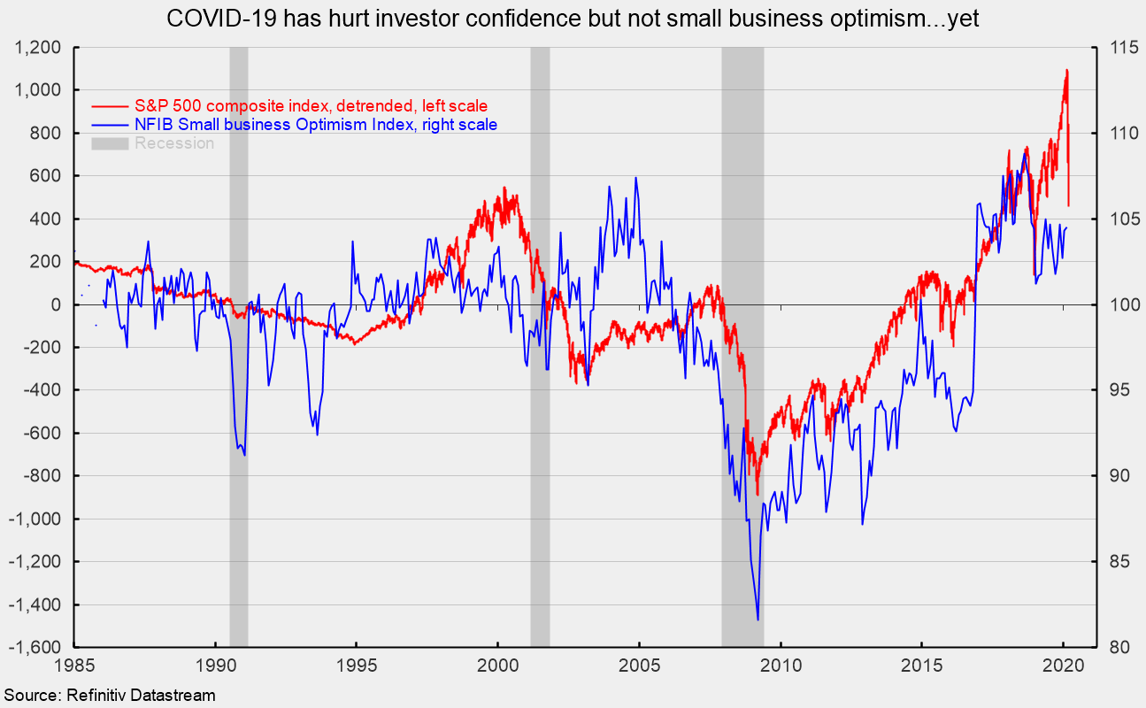 Among the key take aways are concern over the tight labor market and the difficulty in finding qualified workers. The persistent high level of optimism stands in sharp contrast to investor optimism as reflected in the performance of the S&P 500. The popular benchmark index has declined sharply in recent weeks over fears over COVID-19 spread (see chart). The effects of the COVID-19 outbreak remain fairly limited for the small-business sector.