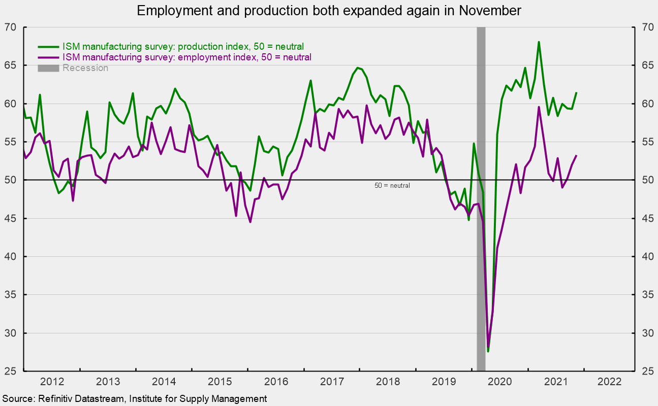 The Institute for Supply Managementโs Manufacturing Purchasing Managersโ Index rose to 61.1 in November, up 0.3 points from 60.8 percent in October. November is the 18th consecutive reading above the neutral 50 threshold and the ninth month above 60 in the last 12 months (see top of first chart). The survey results suggest that the manufacturing sector continues to expand at a robust pace.