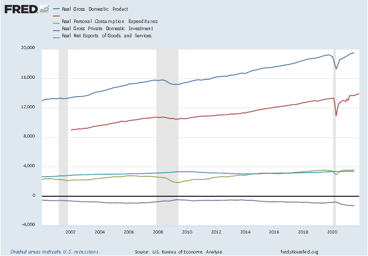 Consumption purchases generally account for about 70 percent of US GDP (Figure 1). Investment is highly volatile, and can account for less than 10 percent to more than 20 percent. For example, during a recession, investment generally falls, usually in greater proportion than any other part of GDP. Government purchases generally account for 20 percent of GDP. Net exports are negative for the US, since about 1970, and recently accounted for about -6 percent of US GDP. Figure 1 shows that investment fell rather dramatically during the 2007-2009 Great Recession. Note though that during the Covid-19 recession in 2020, consumption spending fell more, and took a long time to recoverโthis shows that the Covid-19 recession was highly unusual.