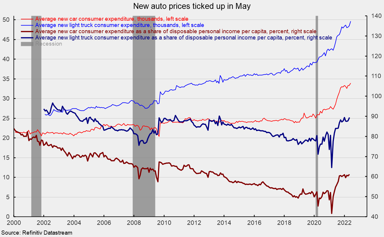 As a share of disposable personal income per capita, average consumer expenditures on a car came in at 61.2 percent versus 60.4 in April and up sharply from 51.8 percent in December 2019. The average consumer expenditure on a light truck as a share of disposable personal income per capita was 89.4 percent versus 87.7 percent in April and 78.8 percent in December 2019 (see fourth chart). Both measures are about equal to the 2014 percentages.
