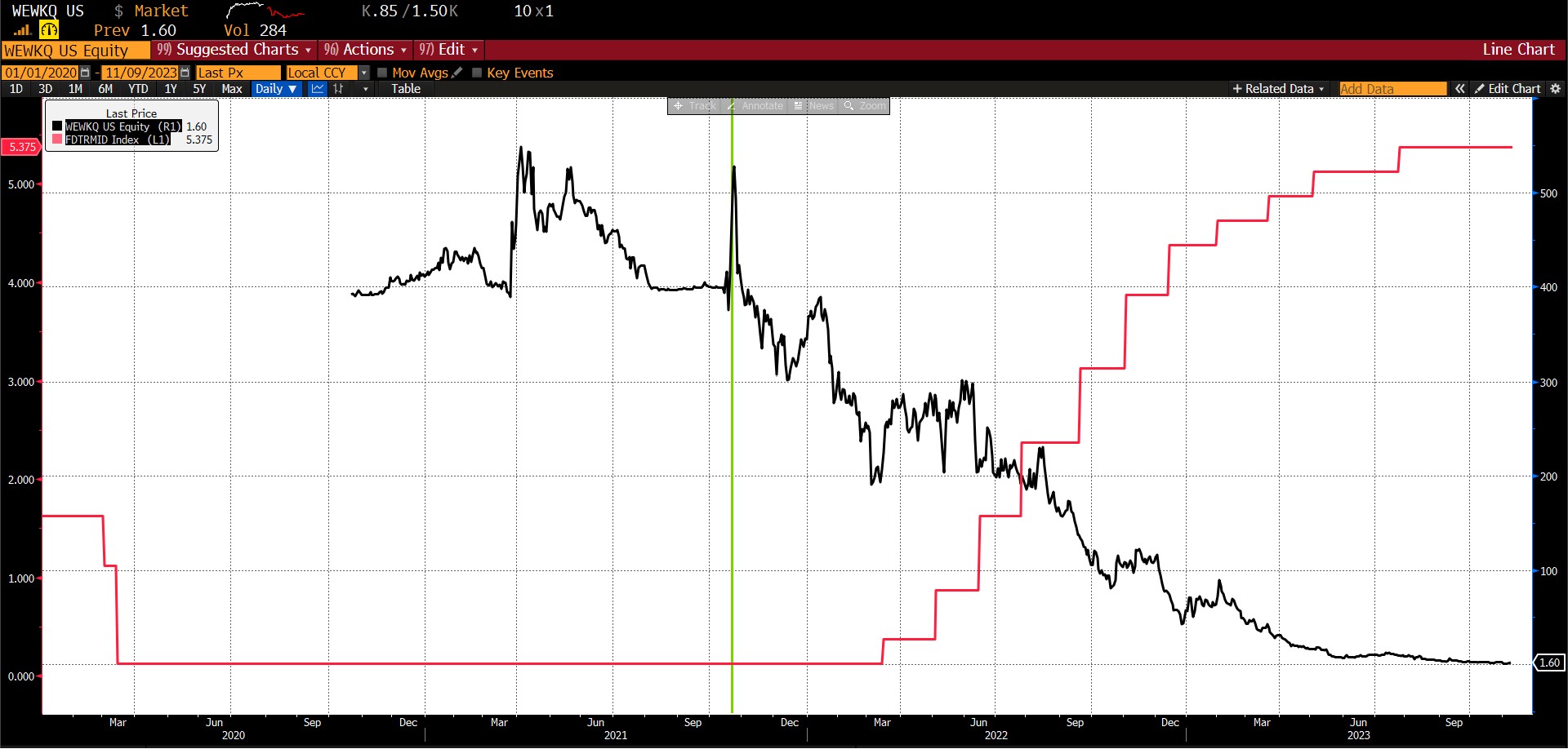 Fed Funds rate (red), WeWork stock price (black, w/first trading date green horizontal line)