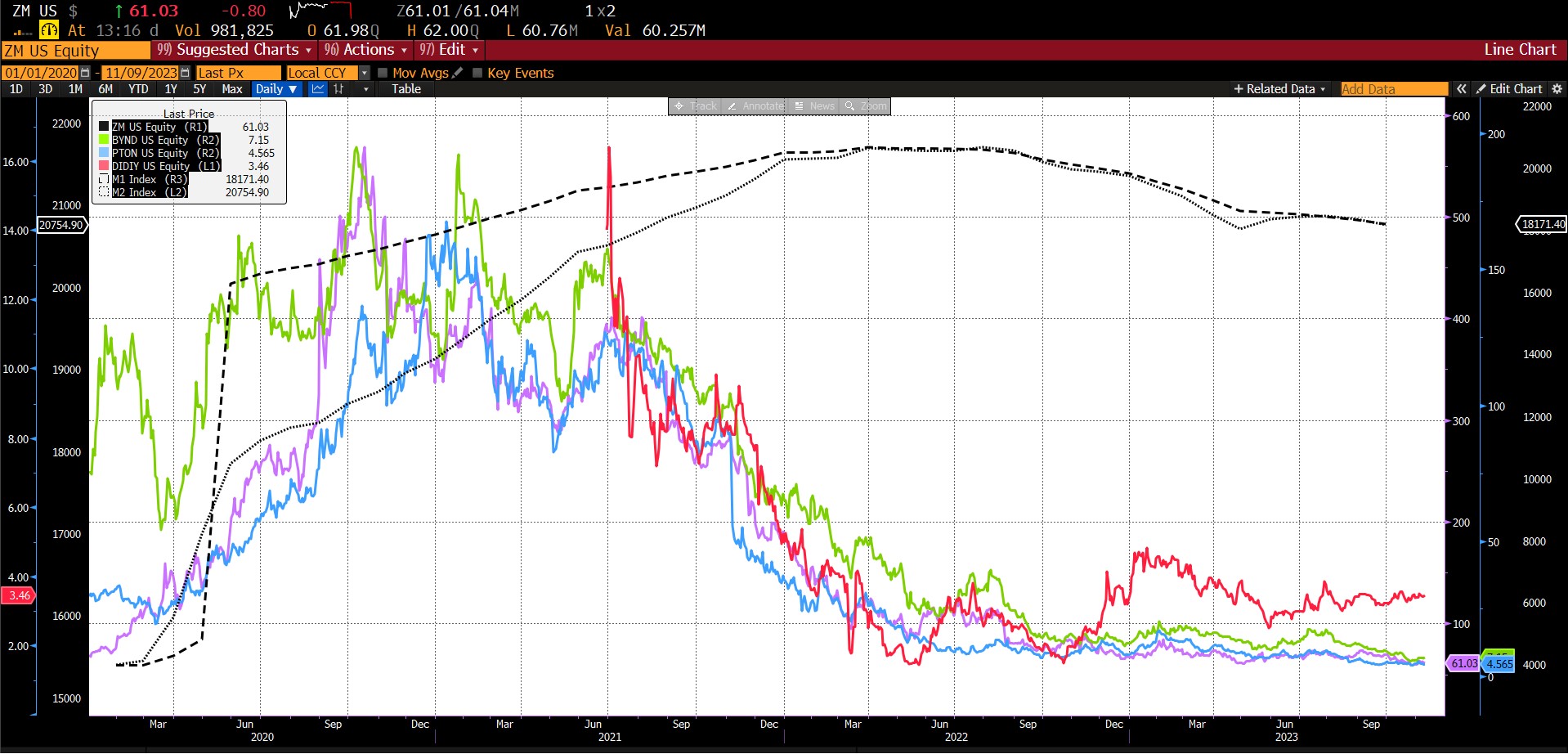 Stock prices of Peloton (blue), Beyond Meat (green), Zoom (purple), and Didi Global ADR (red), M1 Money Supply Index (black dash), and M2 Money Supply M2 Index (black dots), 2020 – present